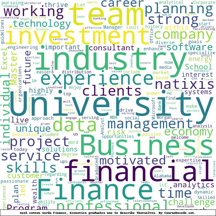 Here is a visual representation of the most common words seen in the "about" section of LinkedIn profiles who have a Bachelor degree in Finance, Economics. This may or may not be useful: