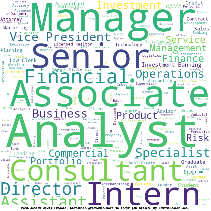 Here is a visual representation of the most common words in job titles for Finance, Economics graduates: