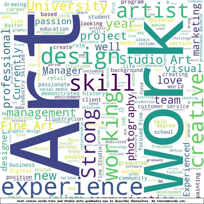Here is a visual representation of the most common words seen in the "about" section of LinkedIn profiles who have a Bachelor degree in Fine and Studio Arts. This may or may not be useful: