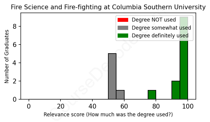 The verdict? Significantly above average. Overall, with an average relevance score of 81%, Fire Science and Fire-fighting graduates from Columbia Southern University have a much higher likelihood (+14%) of finding work in this field compared to the average graduate across all fields: