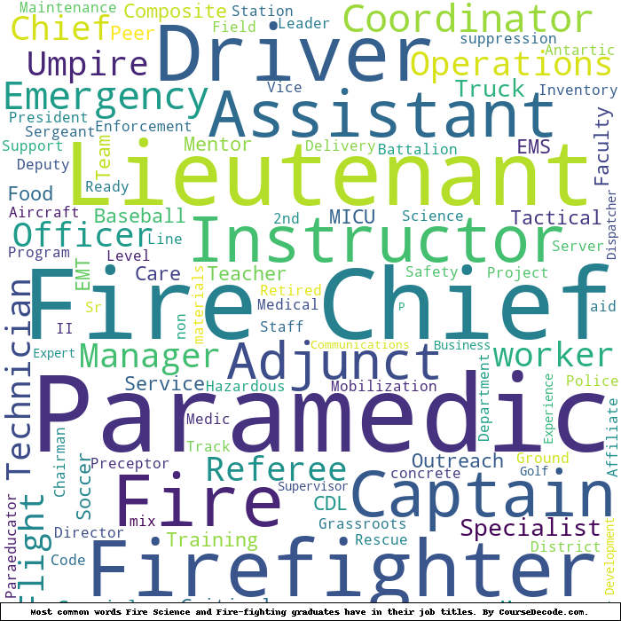 Here is a visual representation of the most common words in job titles for Fire Science and Fire-fighting graduates (this is across all Fire Science and Fire-fighting graduates we've analyzed, not just those who went to Columbia Southern University):