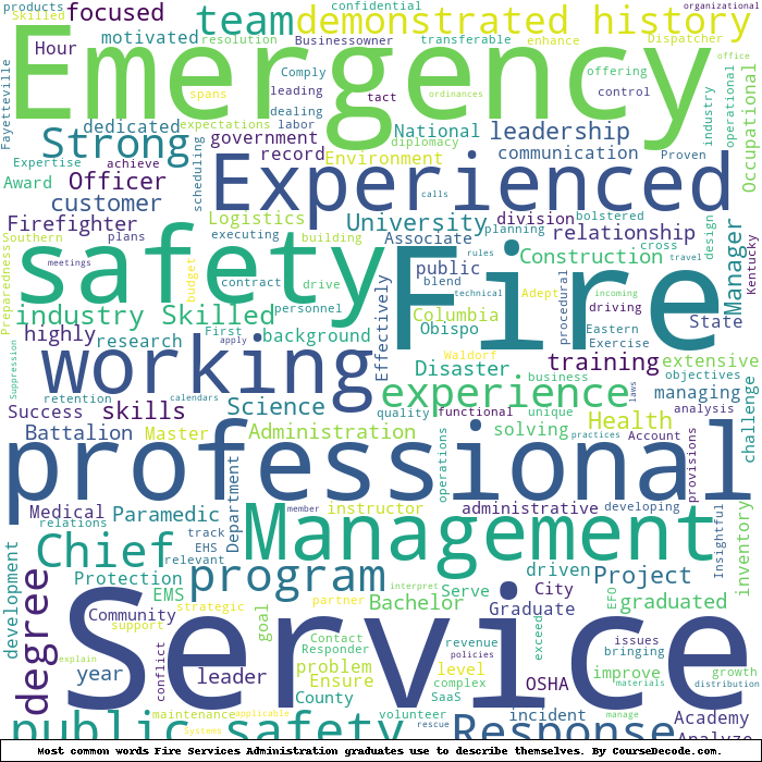Here is a visual representation of the most common words seen in the "about" section of LinkedIn profiles who have a Bachelor degree in Fire Services Administration (this is across all Fire Services Administration graduates we've analyzed, not just those who went to Columbia Southern University). This may or may not be useful: