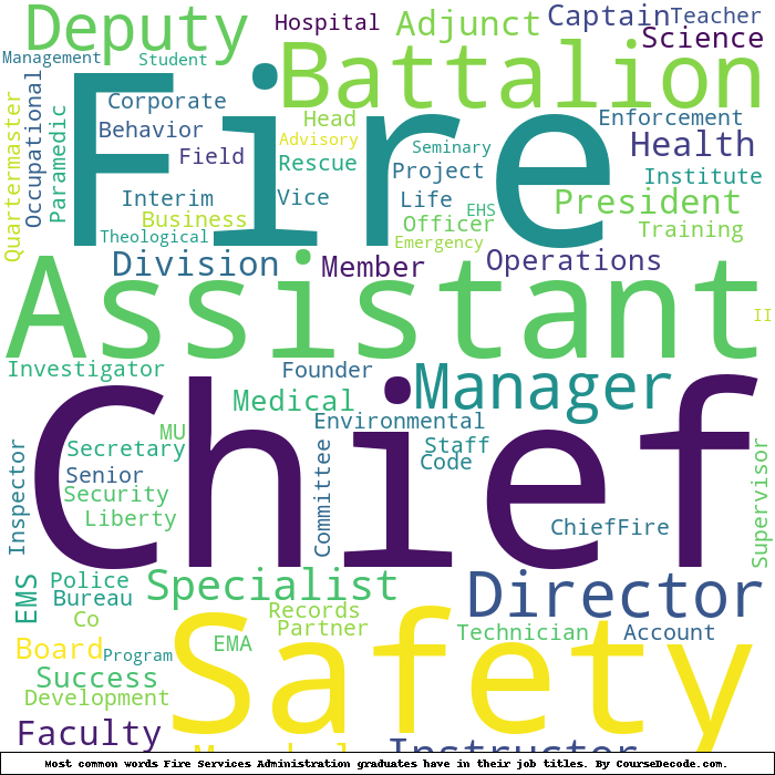 Here is a visual representation of the most common words in job titles for Fire Services Administration graduates (this is across all Fire Services Administration graduates we've analyzed, not just those who went to Columbia Southern University):