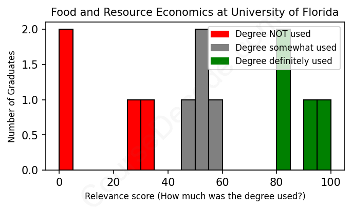 The verdict? Significantly below average. Overall, with an average relevance score of 52%, Food and Resource Economics graduates from University of Florida have a much lower likelihood (-15%) of finding work in this field compared to the average graduate across all fields: