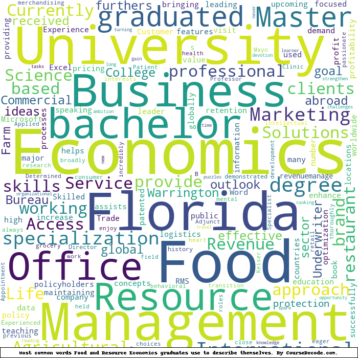 Here is a visual representation of the most common words seen in the "about" section of LinkedIn profiles who have a Bachelor degree in Food and Resource Economics (this is across all Food and Resource Economics graduates we've analyzed, not just those who went to University of Florida). This may or may not be useful: