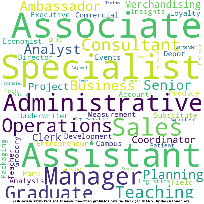 Here is a visual representation of the most common words in job titles for Food and Resource Economics graduates (this is across all Food and Resource Economics graduates we've analyzed, not just those who went to University of Florida):