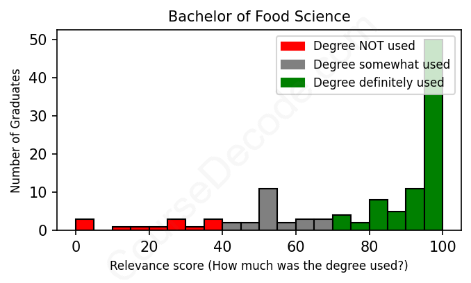 The verdict? Above average. Overall, with an average relevance score of 77%, Food Science graduates have a higher likelihood (+10%) of finding work in this field compared to the average graduate across all fields: