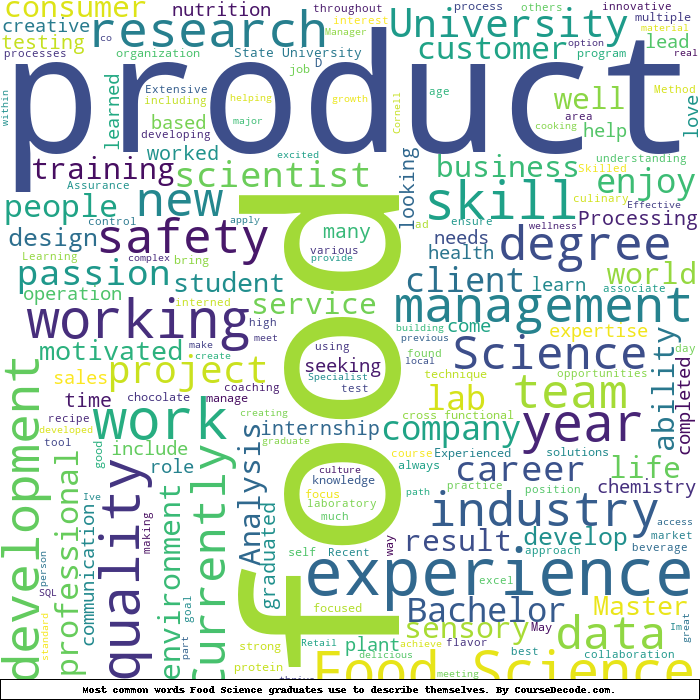 Here is a visual representation of the most common words seen in the "about" section of LinkedIn profiles who have a Bachelor degree in Food Science. This may or may not be useful: