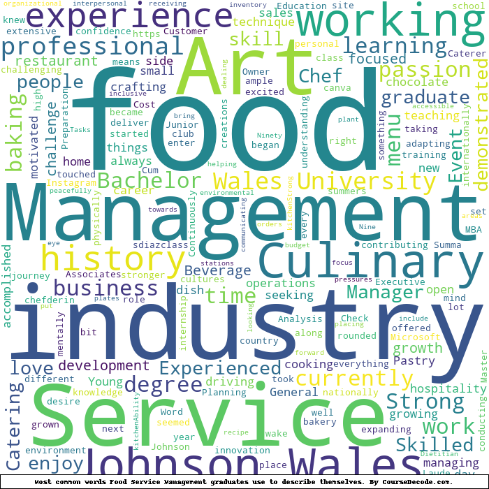 Here is a visual representation of the most common words seen in the "about" section of LinkedIn profiles who have a Bachelor degree in Food Service Management (this is across all Food Service Management graduates we've analyzed, not just those who went to Johnson & Wales University). This may or may not be useful: