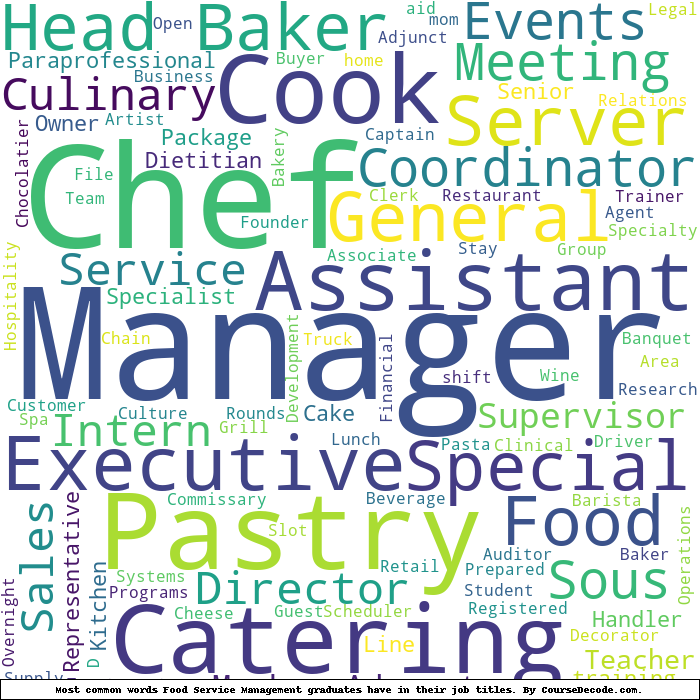 Here is a visual representation of the most common words in job titles for Food Service Management graduates (this is across all Food Service Management graduates we've analyzed, not just those who went to Johnson & Wales University):