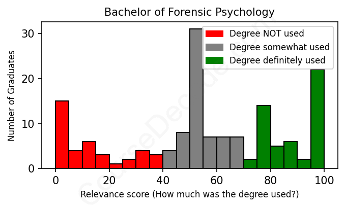 The verdict? Significantly below average. Overall, with an average relevance score of 54%, Forensic Psychology graduates have a much lower likelihood (-13%) of finding work in this field compared to the average graduate across all fields: