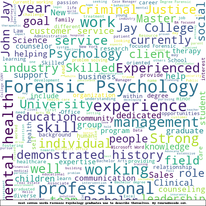 Here is a visual representation of the most common words seen in the "about" section of LinkedIn profiles who have a Bachelor degree in Forensic Psychology. This may or may not be useful: