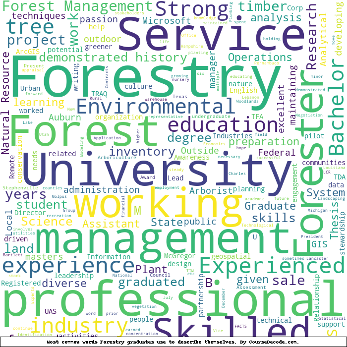 Here is a visual representation of the most common words seen in the "about" section of LinkedIn profiles who have a Bachelor degree in Forestry. This may or may not be useful: