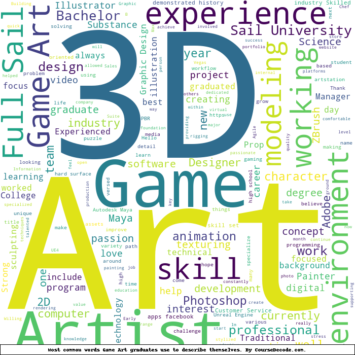 Here is a visual representation of the most common words seen in the "about" section of LinkedIn profiles who have a Bachelor degree in Game Art. This may or may not be useful: