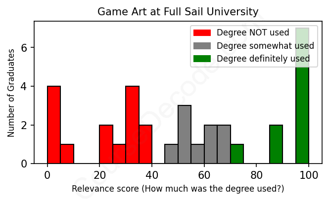 The verdict? Significantly below average. Overall, with an average relevance score of 52%, Game Art graduates from Full Sail University have a much lower likelihood (-15%) of finding work in this field compared to the average graduate across all fields: