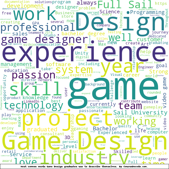 Here is a visual representation of the most common words seen in the "about" section of LinkedIn profiles who have a Bachelor degree in Game Design. This may or may not be useful: