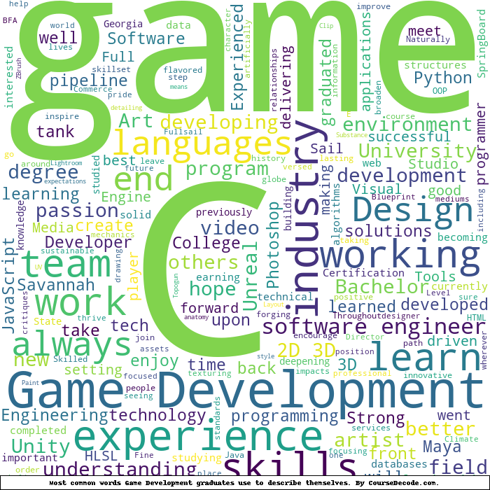 Here is a visual representation of the most common words seen in the "about" section of LinkedIn profiles who have a Bachelor degree in Game Development (this is across all Game Development graduates we've analyzed, not just those who went to Full Sail University). This may or may not be useful: