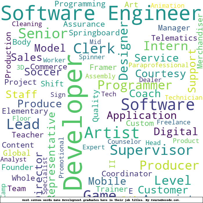 Here is a visual representation of the most common words in job titles for Game Development graduates (this is across all Game Development graduates we've analyzed, not just those who went to Full Sail University):