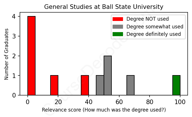 The verdict? Horrible! Overall, with an average relevance score of 34%, General Studies graduates from Ball State University have an exceptionally lower likelihood (-33%) of finding work in this field compared to the average graduate across all fields: