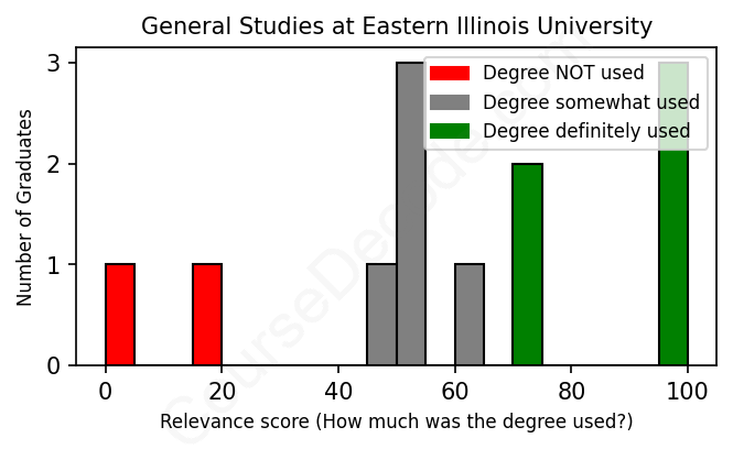 The verdict? Below average. Overall, with an average relevance score of 59%, General Studies graduates from Eastern Illinois University have a lower likelihood (-8%) of finding work in this field compared to the average graduate across all fields: