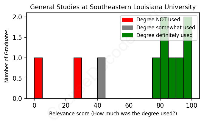 The verdict? Slightly above average. Overall, with an average relevance score of 69%, General Studies graduates from Southeastern Louisiana University have a slightly higher likelihood (+2%) of finding work in this field compared to the average graduate across all fields: