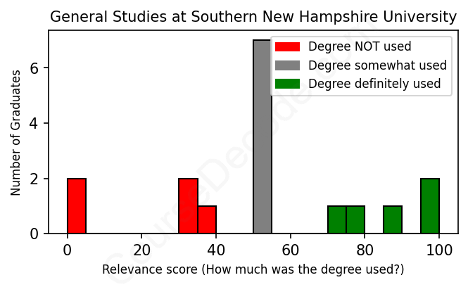 The verdict? Significantly below average. Overall, with an average relevance score of 52%, General Studies graduates from Southern New Hampshire University have a much lower likelihood (-15%) of finding work in this field compared to the average graduate across all fields: