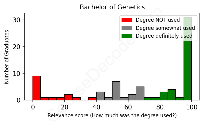 The verdict? On par with the average. Overall, with an average relevance score of 67%, Genetics graduates have about the same likelihood of finding work in this field as the average graduate across all fields: