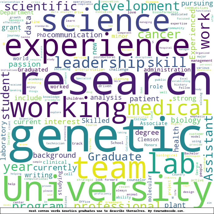 Here is a visual representation of the most common words seen in the "about" section of LinkedIn profiles who have a Bachelor degree in Genetics. This may or may not be useful: