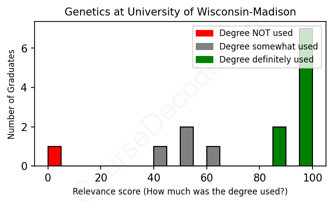 The verdict? Above average. Overall, with an average relevance score of 76%, Genetics graduates from University of Wisconsin-Madison have a higher likelihood (+9%) of finding work in this field compared to the average graduate across all fields: