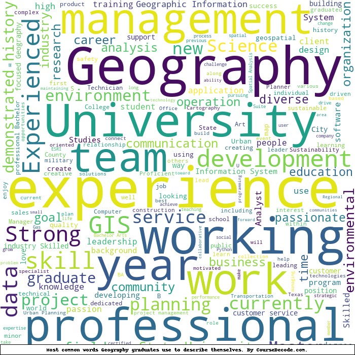 Here is a visual representation of the most common words seen in the "about" section of LinkedIn profiles who have a Bachelor degree in Geography. This may or may not be useful: