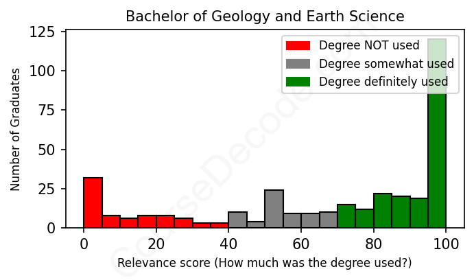 The verdict? On par with the average. Overall, with an average relevance score of 67%, Geology and Earth Science graduates have about the same likelihood of finding work in this field as the average graduate across all fields: