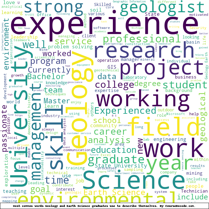 Here is a visual representation of the most common words seen in the "about" section of LinkedIn profiles who have a Bachelor degree in Geology and Earth Science. This may or may not be useful: