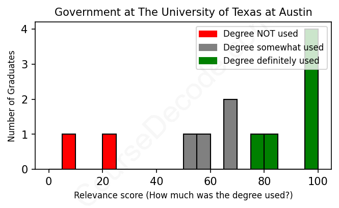 The verdict? Slightly above average. Overall, with an average relevance score of 68%, Government graduates from The University of Texas at Austin have a slightly higher likelihood (+1%) of finding work in this field compared to the average graduate across all fields: