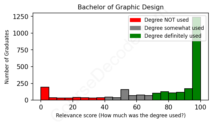 The verdict? Above average. Overall, with an average relevance score of 74%, Graphic Design graduates have a higher likelihood (+7%) of finding work in this field compared to the average graduate across all fields: