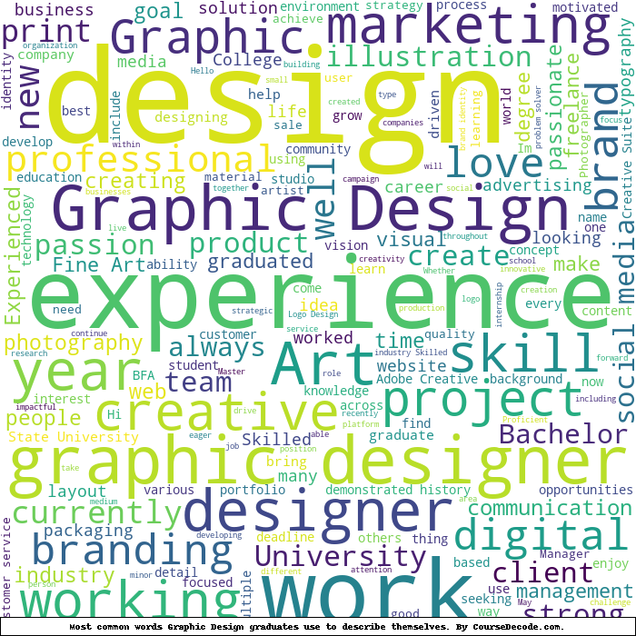 Here is a visual representation of the most common words seen in the "about" section of LinkedIn profiles who have a Bachelor degree in Graphic Design. This may or may not be useful:
