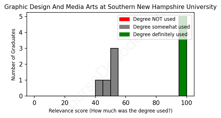 The verdict? Above average. Overall, with an average relevance score of 73%, Graphic Design And Media Arts graduates from Southern New Hampshire University have a higher likelihood (+6%) of finding work in this field compared to the average graduate across all fields:
