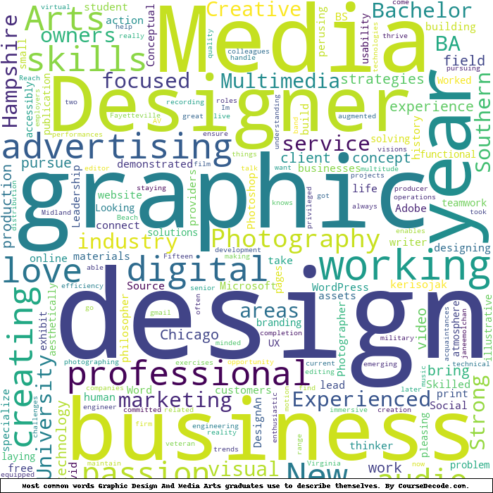 Here is a visual representation of the most common words seen in the "about" section of LinkedIn profiles who have a Bachelor degree in Graphic Design And Media Arts (this is across all Graphic Design And Media Arts graduates we've analyzed, not just those who went to Southern New Hampshire University). This may or may not be useful:
