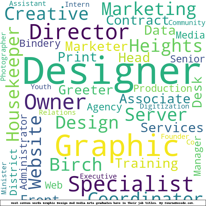 Here is a visual representation of the most common words in job titles for Graphic Design And Media Arts graduates (this is across all Graphic Design And Media Arts graduates we've analyzed, not just those who went to Southern New Hampshire University):