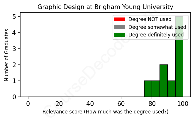 The verdict? Great! Overall, with an average relevance score of 92%, Graphic Design graduates from Brigham Young University have a substantially higher likelihood (+25%) of finding work in this field compared to the average graduate across all fields: