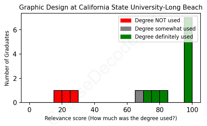 The verdict? Above average. Overall, with an average relevance score of 75%, Graphic Design graduates from California State University-Long Beach have a higher likelihood (+8%) of finding work in this field compared to the average graduate across all fields: