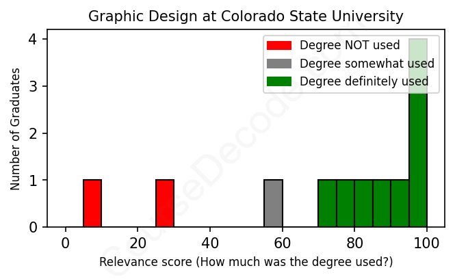 The verdict? Above average. Overall, with an average relevance score of 74%, Graphic Design graduates from Colorado State University have a higher likelihood (+7%) of finding work in this field compared to the average graduate across all fields: