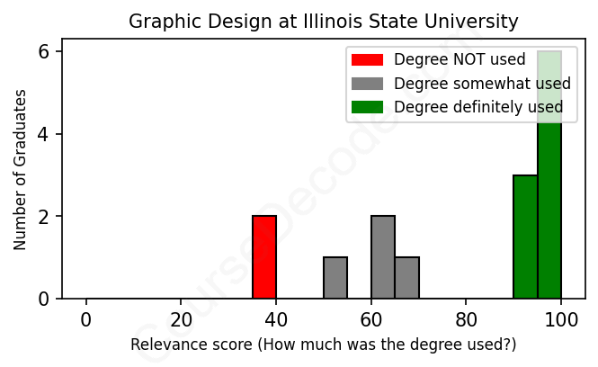 The verdict? Significantly above average. Overall, with an average relevance score of 79%, Graphic Design graduates from Illinois State University have a much higher likelihood (+12%) of finding work in this field compared to the average graduate across all fields: