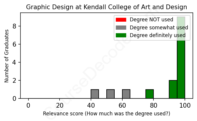 The verdict? Significantly above average. Overall, with an average relevance score of 87%, Graphic Design graduates from Kendall College of Art and Design have a much higher likelihood (+20%) of finding work in this field compared to the average graduate across all fields: