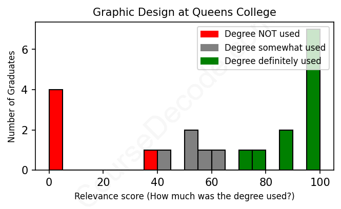 The verdict? Slightly below average. Overall, with an average relevance score of 62%, Graphic Design graduates from Queens College have a slightly lower likelihood (-5%) of finding work in this field compared to the average graduate across all fields: