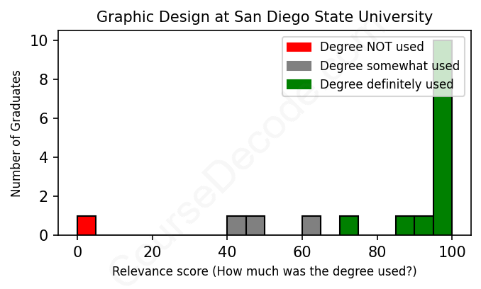 The verdict? Significantly above average. Overall, with an average relevance score of 82%, Graphic Design graduates from San Diego State University have a much higher likelihood (+15%) of finding work in this field compared to the average graduate across all fields: