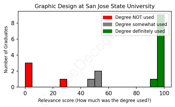 The verdict? Slightly above average. Overall, with an average relevance score of 68%, Graphic Design graduates from San Jose State University have a slightly higher likelihood (+1%) of finding work in this field compared to the average graduate across all fields: