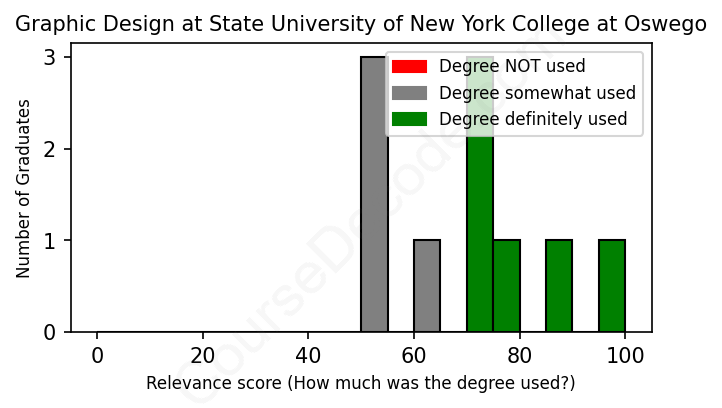 The verdict? Slightly above average. Overall, with an average relevance score of 69%, Graphic Design graduates from State University of New York College at Oswego have a slightly higher likelihood (+2%) of finding work in this field compared to the average graduate across all fields: