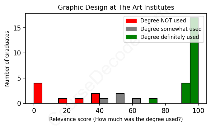 The verdict? Slightly above average. Overall, with an average relevance score of 71%, Graphic Design graduates from The Art Institutes have a slightly higher likelihood (+4%) of finding work in this field compared to the average graduate across all fields: