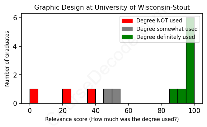 The verdict? Slightly above average. Overall, with an average relevance score of 71%, Graphic Design graduates from University of Wisconsin-Stout have a slightly higher likelihood (+4%) of finding work in this field compared to the average graduate across all fields: