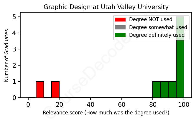 The verdict? Significantly above average. Overall, with an average relevance score of 78%, Graphic Design graduates from Utah Valley University have a much higher likelihood (+11%) of finding work in this field compared to the average graduate across all fields: